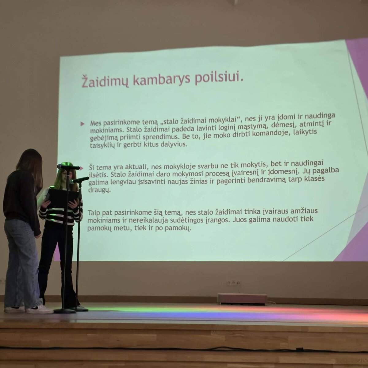 Šiais metais dalyviai pristatė daug įdomių ir įvairių projektų – nuo poilsio zonų iki erdvių aktyviam laisvalaikiui ir kūrybai. Idėjas vertino komisija, kurią sudarė progimnazijos direktorė Jolanta Bartkūnienė, mokyklos psichologė Marija Romancova ir progimnazijos tarybos pirmininkė Olga Vetlugina.
