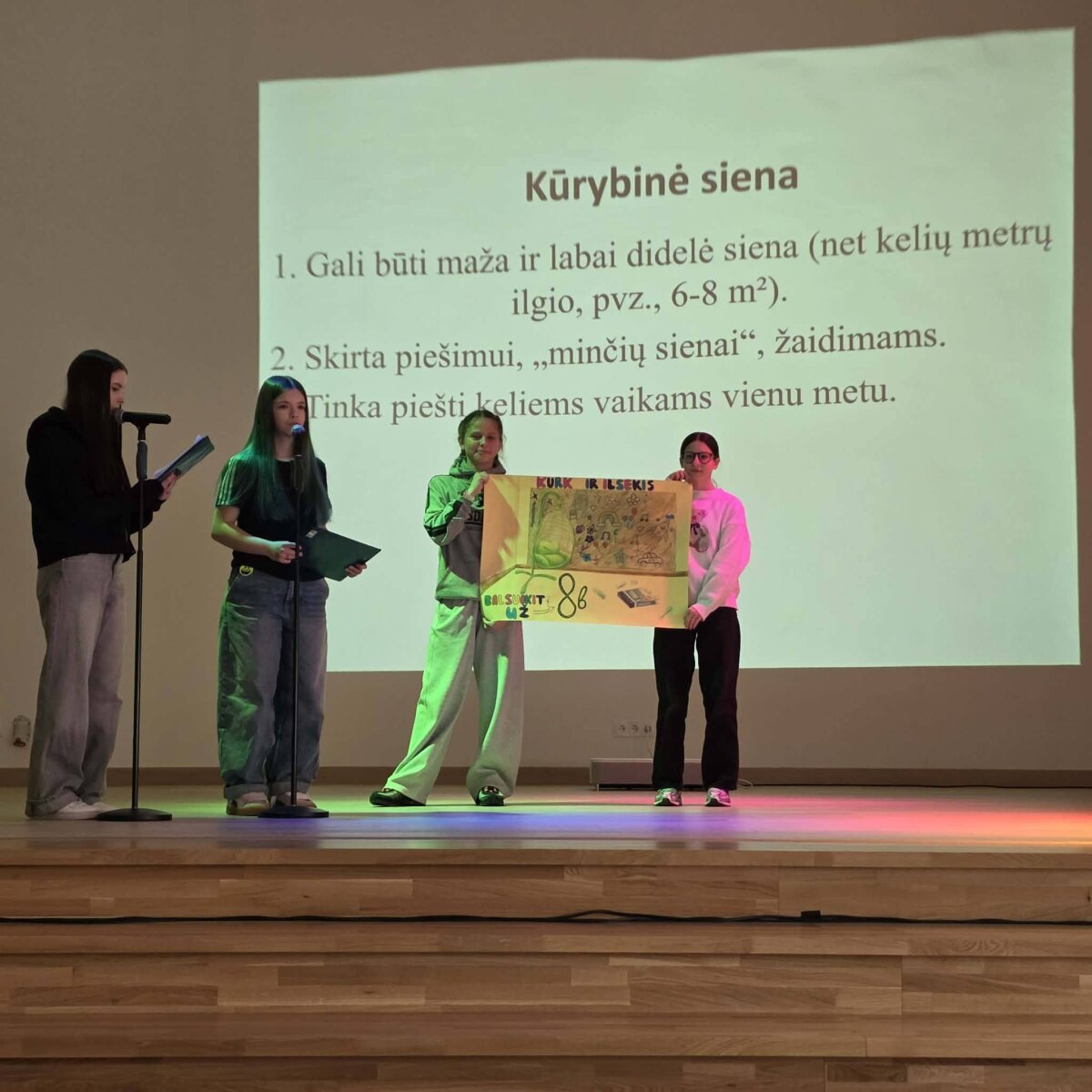 Į finalą pateko trys klasės su savo projektais: 7c su idėja „Žaidimų rinkiniai poilsiui“, 6a su projektu „Krepšinio kiemas“ ir 8b su idėja „Kūrybinė siena“. Finalininkai jau dabar turi galimybę pristatyti ir reklamuoti savo idėjas visoms klasėms, siekdami sulaukti kuo didesnio palaikymo.
